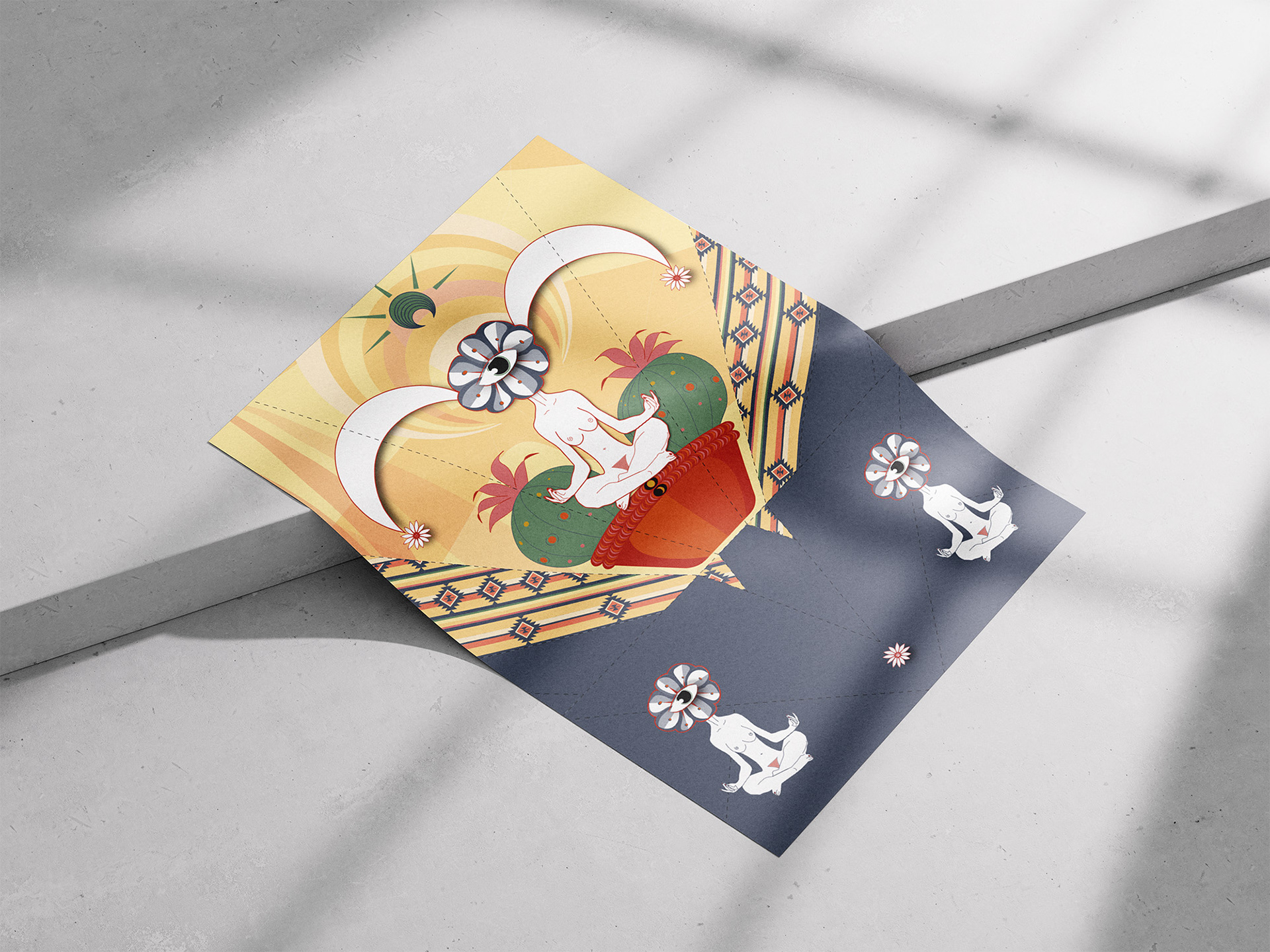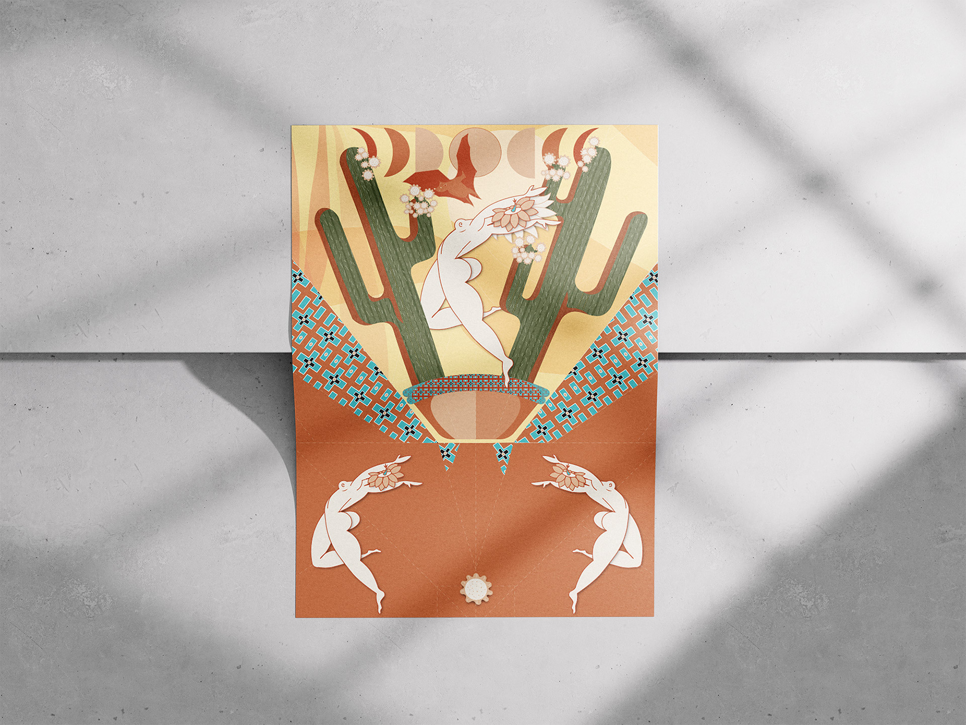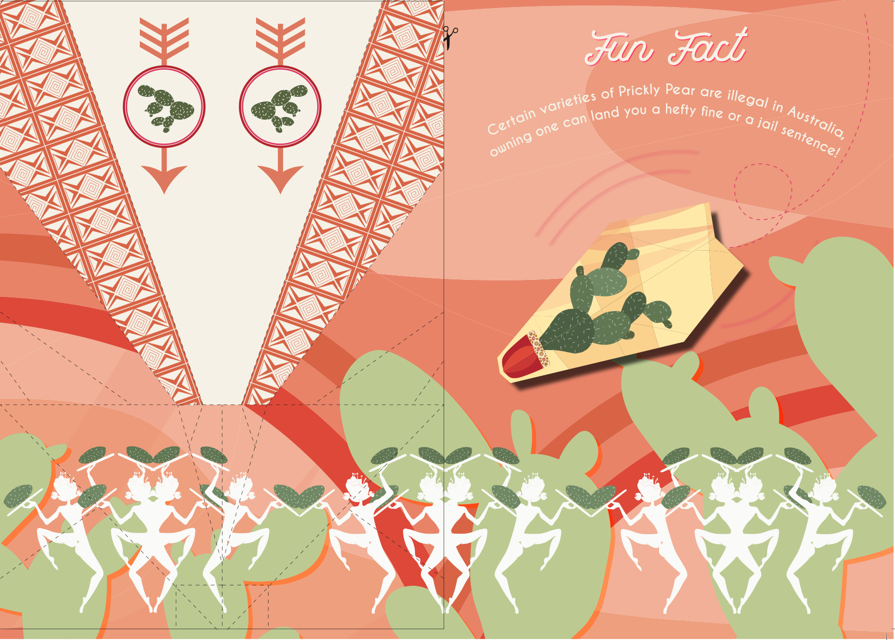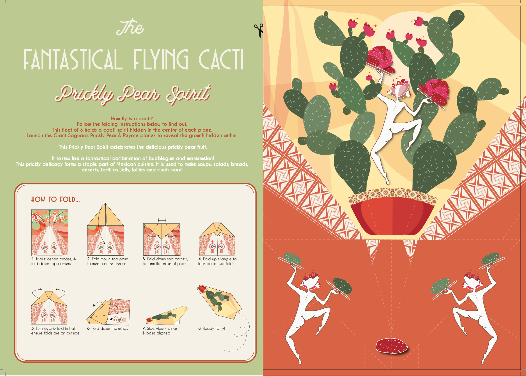 I developed The Flying Cactus Spirits — characters inspired by Prickly Pear, Peyote, and Giant Saguaro cacti. Inspired by mid-century style, the outer surfaces showed simplified cactus forms, while the folds revealed surreal plant “spirits,” symbolising growth and transformation.