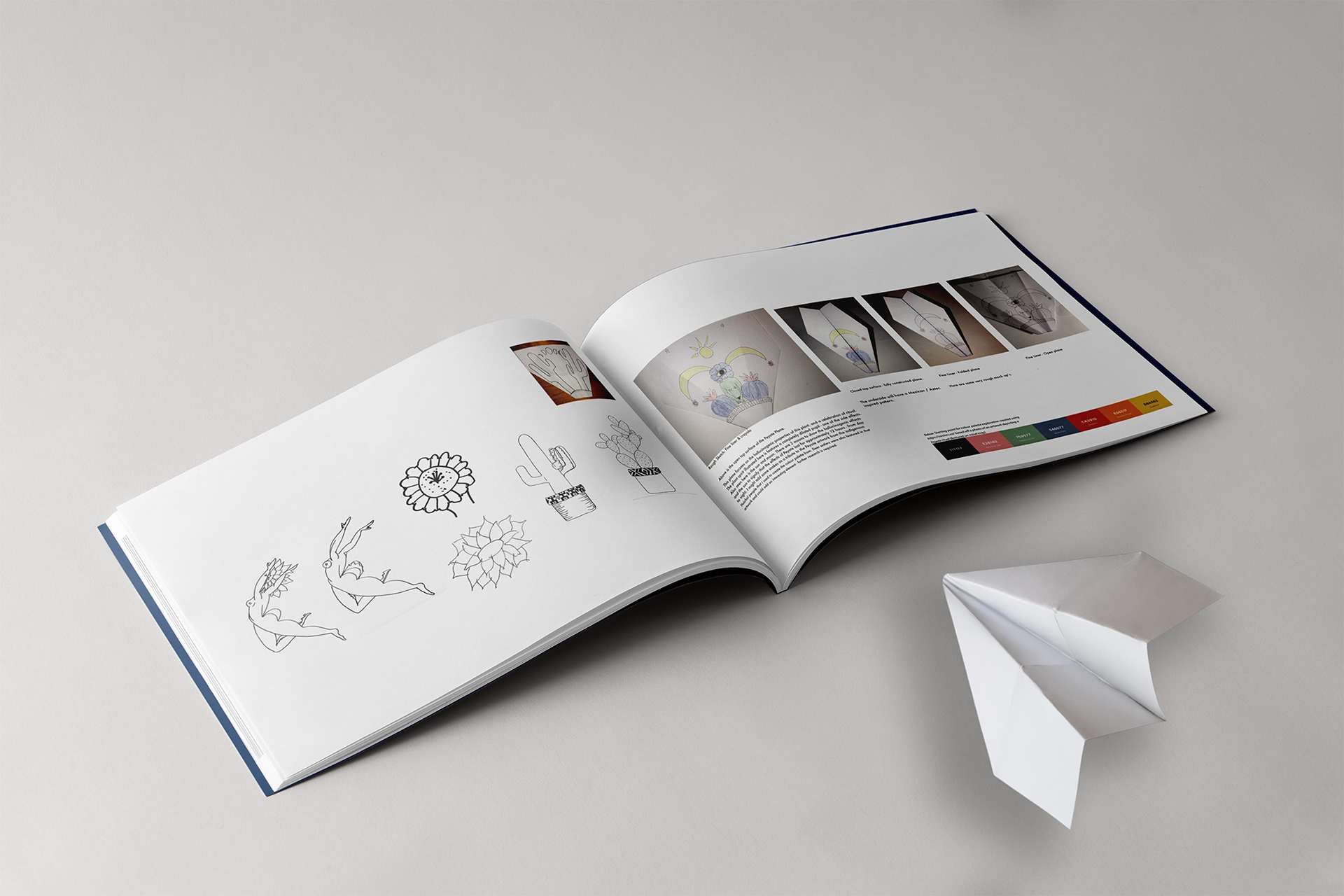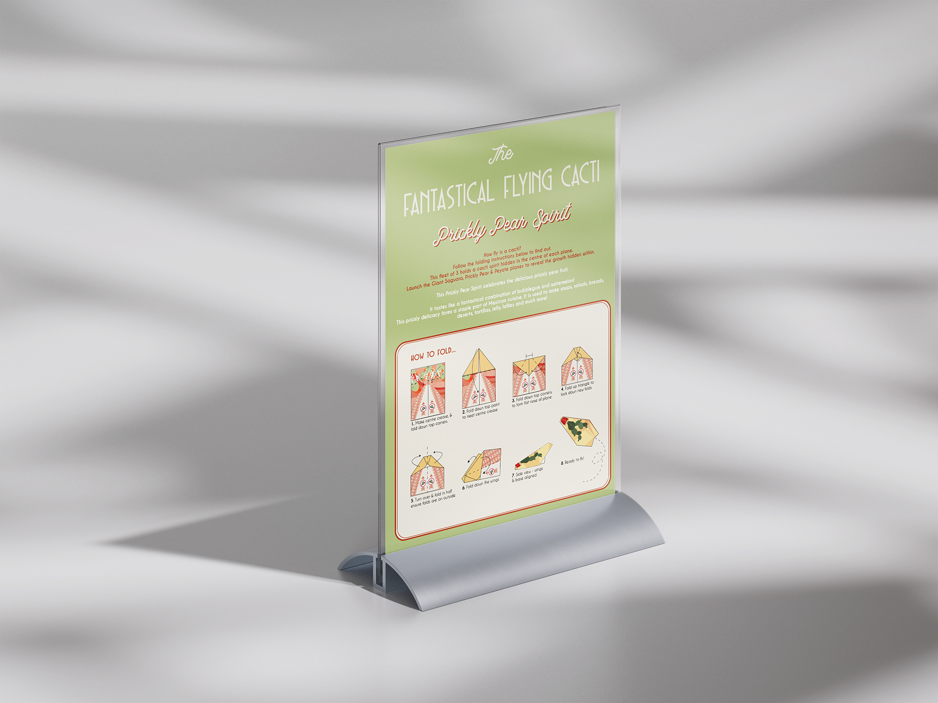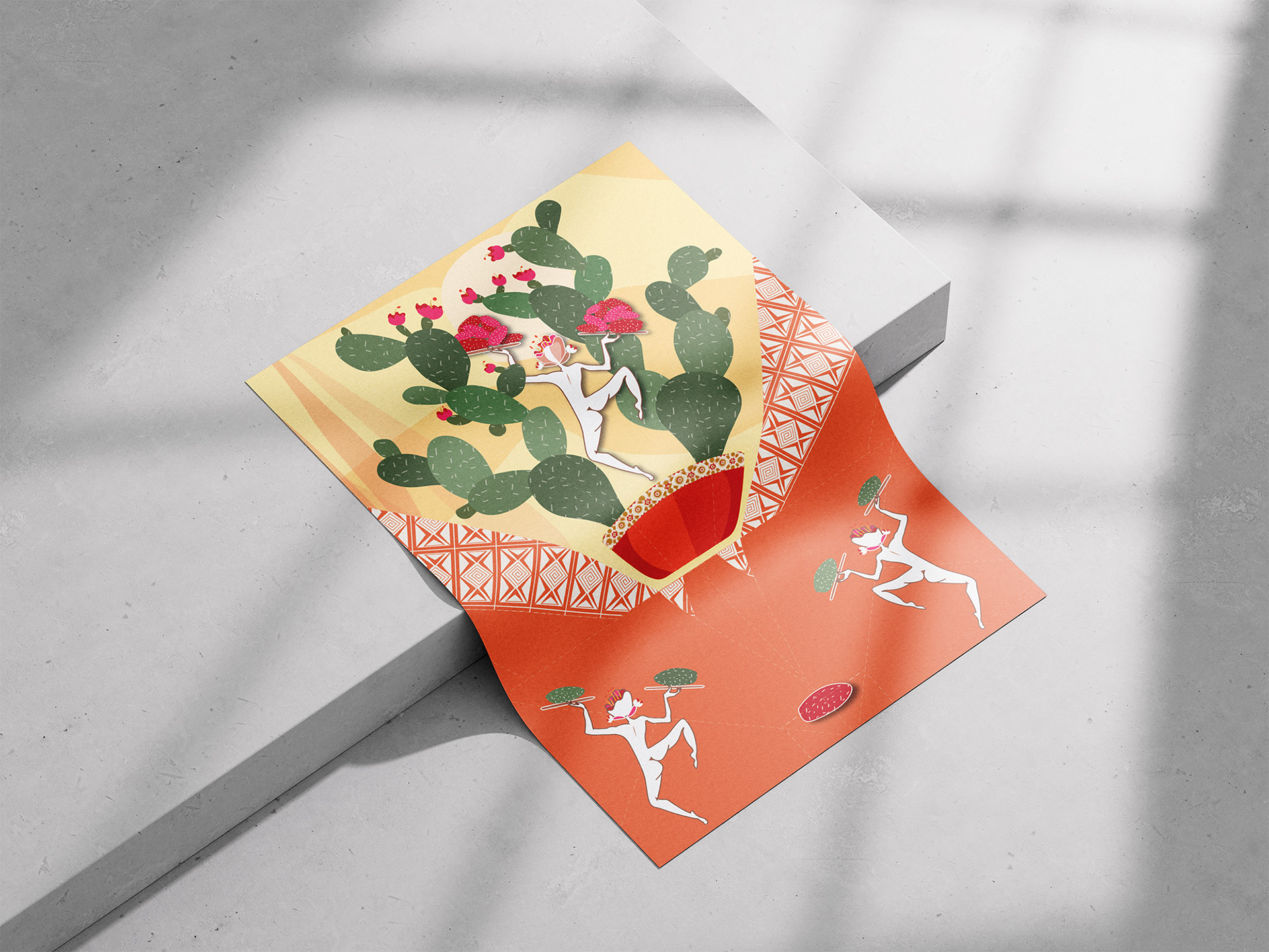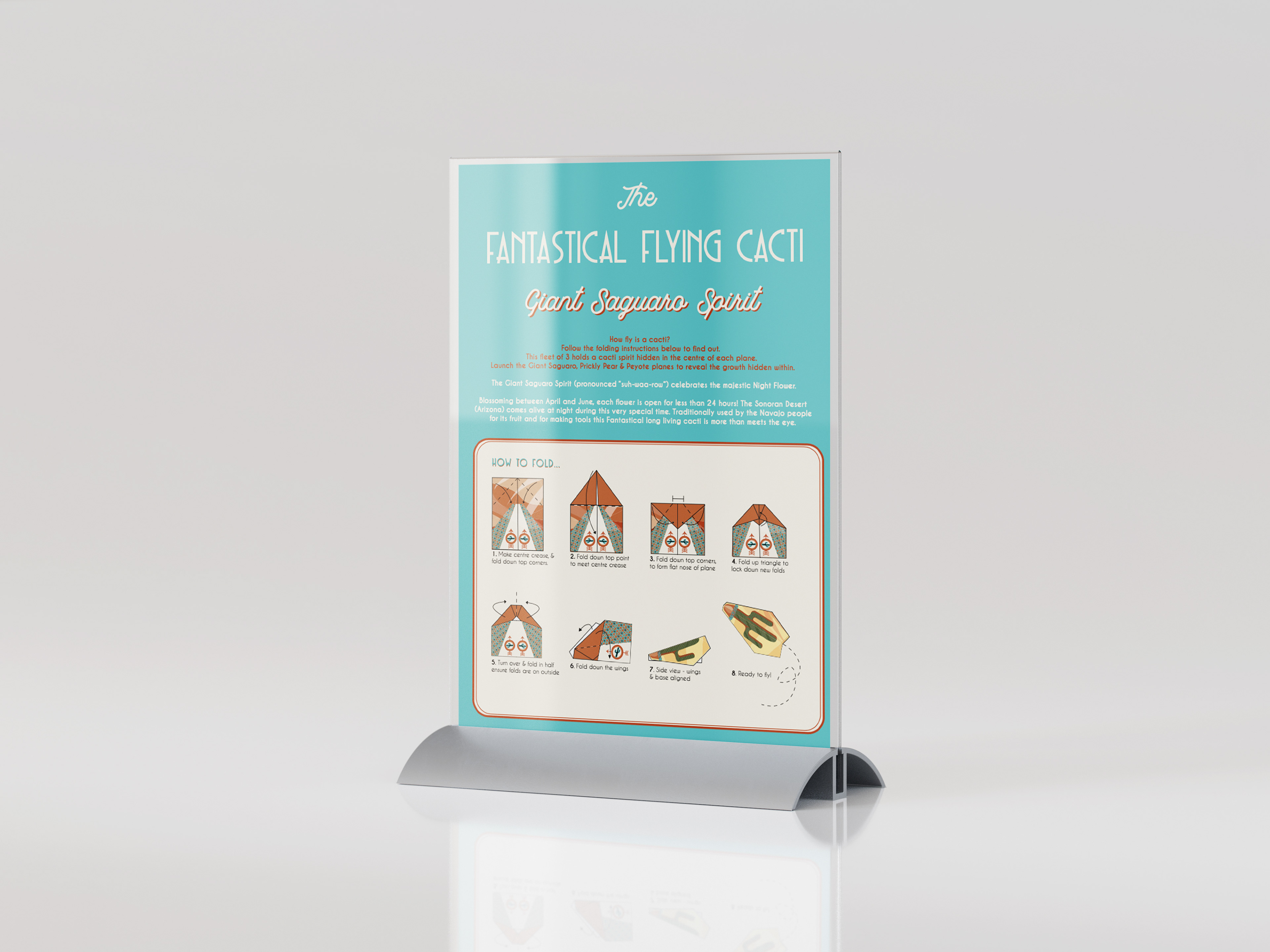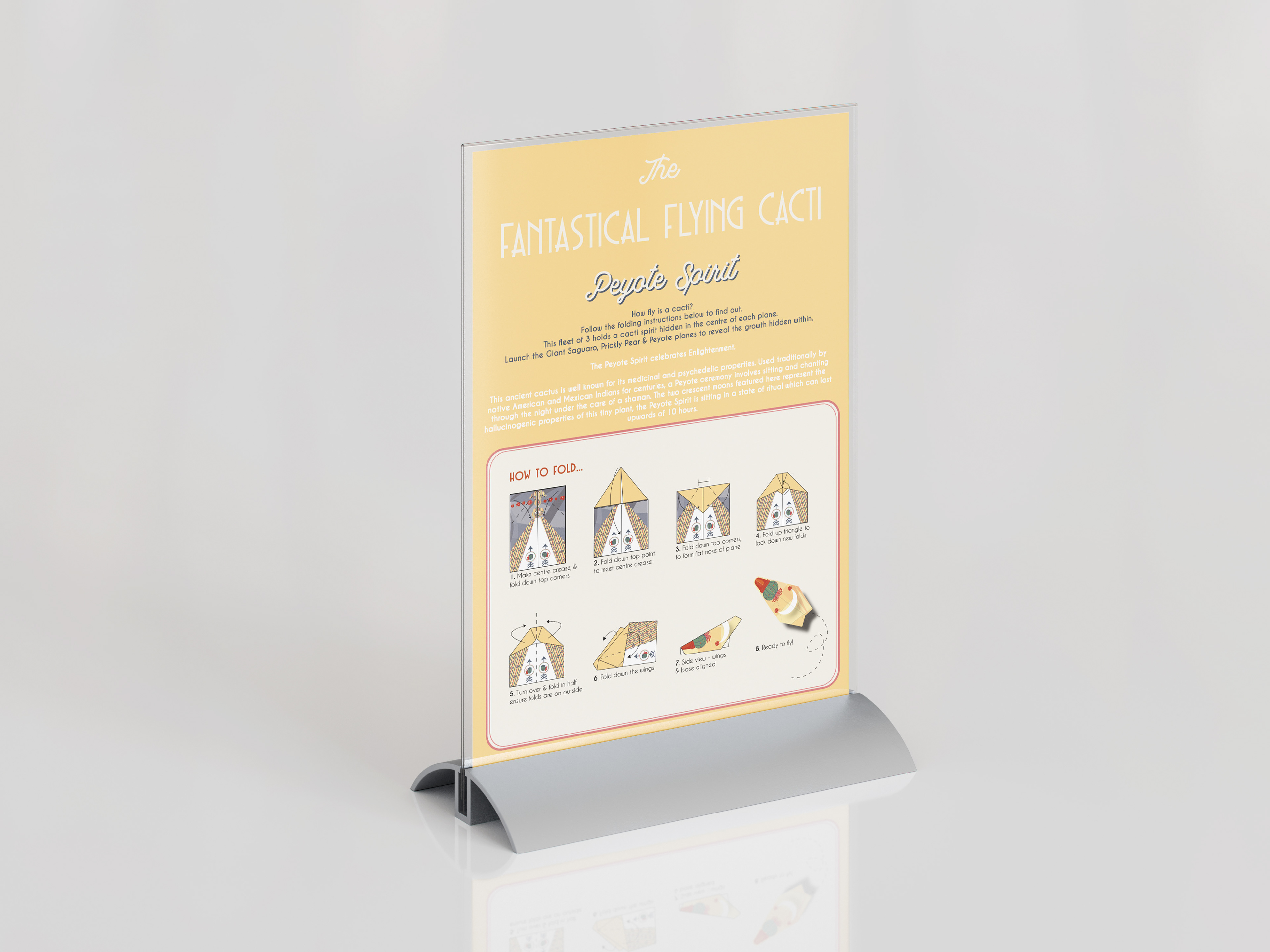 I developed The Flying Cactus Spirits — characters inspired by Prickly Pear, Peyote, and Giant Saguaro cacti. Inspired by mid-century style, the outer surfaces showed simplified cactus forms, while the folds revealed surreal plant “spirits,” symbolising growth and transformation.